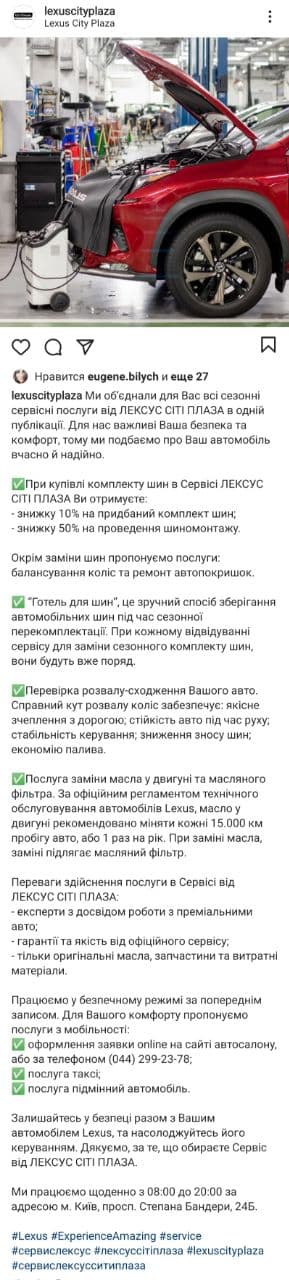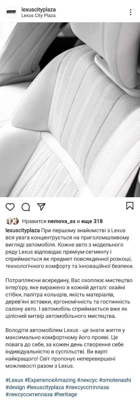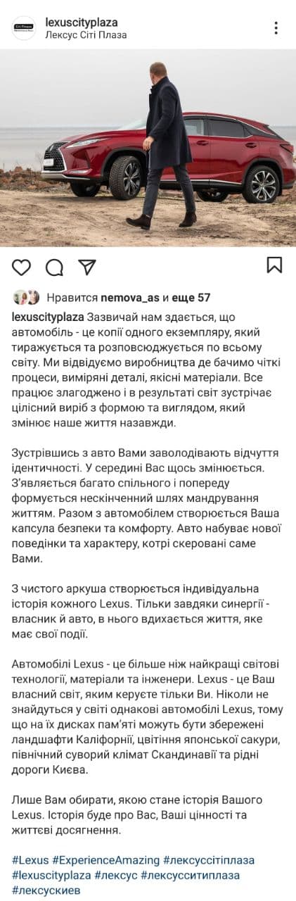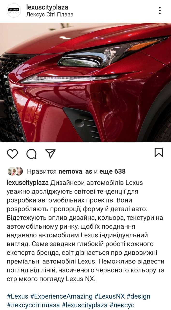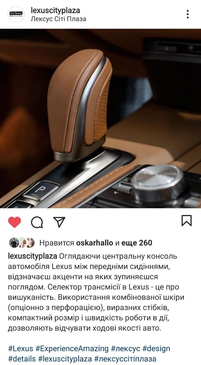 — Концептуальный салон - посетите Лексус Сити Плаза, и убедитесь, что это не обычный автосалон. Мы отличаемся во всем. Во-первых, мы находимся в самом сердце Киева где пересекаются множество энергий, замыслов, решений. Во-вторых, мы больше похожи на креативное пространство, чем на салон-ангар. В-третьих, взаимоотношения с клиентами напоминают дружеское сообщество: стильное пространство, смол-ток, чашечка кофе или необычного японского чая.