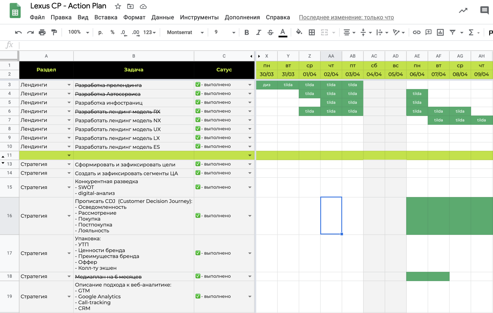 Поскольку проект объемный, работу начали с подробного action-плана. Важно было правильно спланировать, учитывая что есть задачи по отдельным моделям авто, автосервису и продвижению бренда "Лексус Сити Плаза".